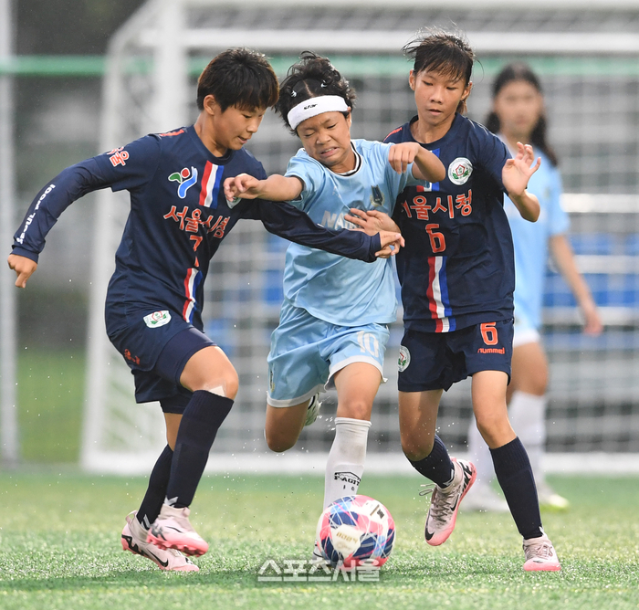 서울 우이초 오연서(왼쪽)와 위지수(오른쪽)가 24일 경남 합천에서 열린 ‘2025 스포츠케이션 명품도시 합천에서 펼쳐지는 제33회 여왕기 전국여자축구대회’ 초등부 충북 남산초와의 8강전에서 남산초 최아인의 공격을 막아내고 있다. 2025. 6. 24.