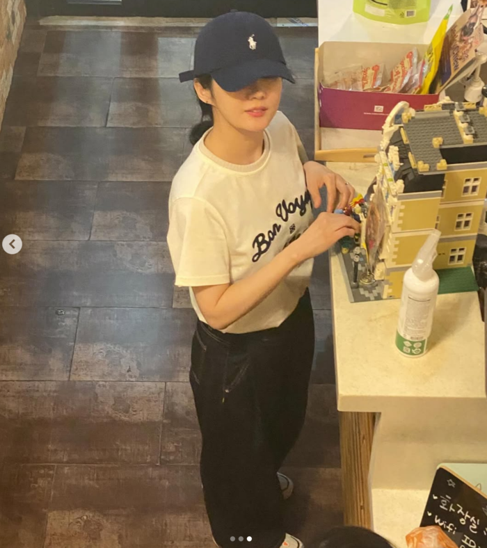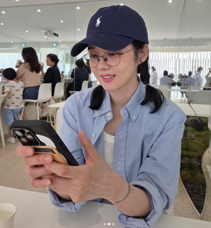 사진 속 장나라는 양갈래로 땋은 헤어스타일에 네이비 색 캡 모자와 하늘색 셔츠를 매치한 코디로 편안한 꾸안꾸 패션을 완성했다.