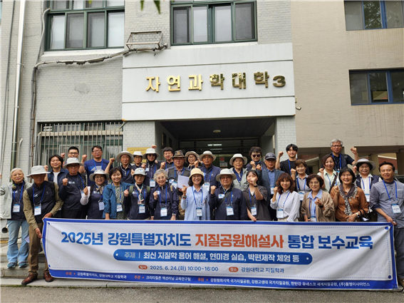 [스포츠서울ㅣ춘천=김기원기자]강원특별자치도(도지사 김진태)는 6월 24일(화) 강원대학교 지질학과(춘천시 소재)에서 도내 지질공원해설사 30명을 대상으로 「2025년 강원특별자치도 지질공원해설사 통합 보수교육」을 성공적으로 개최했다고 밝혔다.