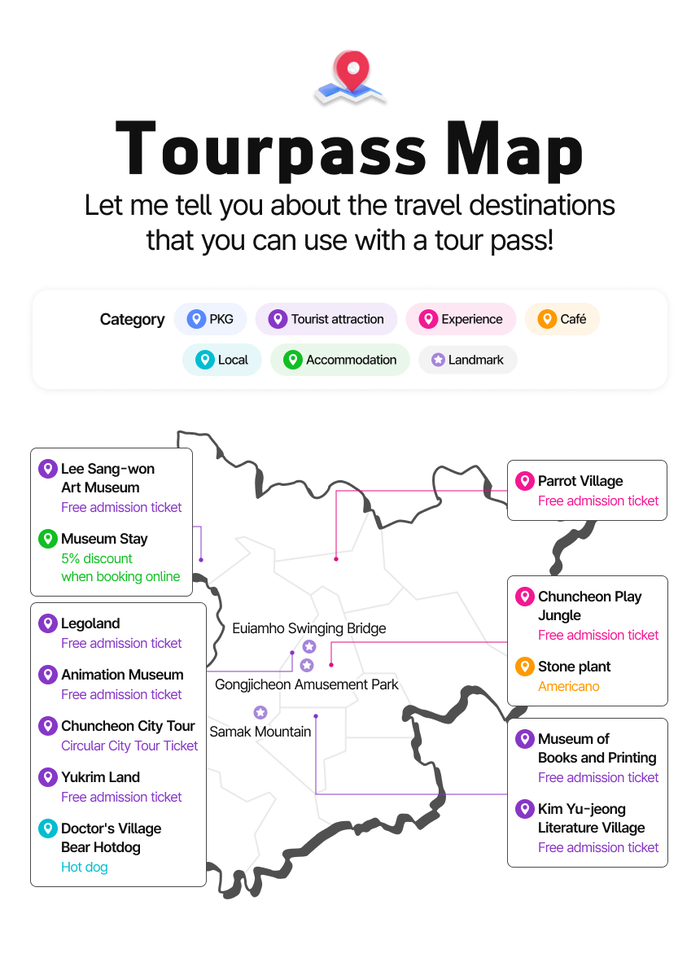 ‘춘천투어패스’는 레고랜드 코리아 리조트와 애니메이션박물관, 플레이정글, 곰핫도그, 스톤플랜트, 이상원미술관&뮤지엄스테이, 책과인쇄박물관, 김유정문학촌, 앵무새마을, 육림랜드, 춘천시티투어 등 총 11개 관광지를 하나의 모바일 티켓으로 자유롭게 이용할 수 있는 통합 관광 상품이다.