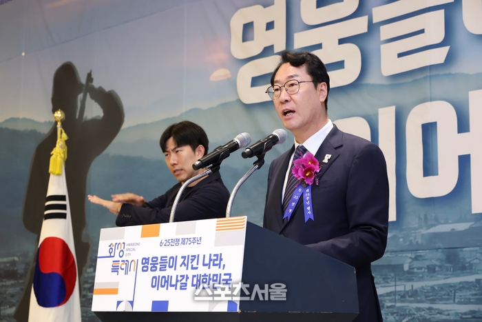 〔스포츠서울│화성=좌승훈기자〕정명근 화성특례시장은 25일 푸르미르호텔에서 ‘영웅들이 지킨 나라, 이어나갈 대한민국’을 슬로건으로 열린 6.25전쟁 제75주년 기념행사에서 “오늘의 평화와 번영은 참전용사 여러분의 숭고한 희생과 용기 덕분”이라며 그 정신을 이어받아 보훈이 일상 속에 숨 쉬는 품격 있는 도시로 거듭나겠다”고 말했다.