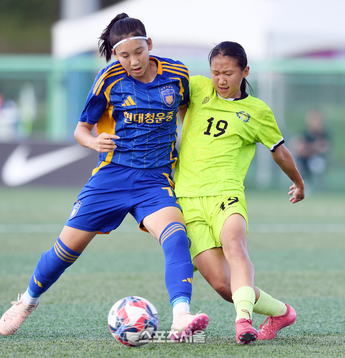 울산 현대청운중 조안(왼쪽)이 25일 경남 합천에서 열린 ‘2025 스포츠케이션 명품도시 합천에서 펼쳐지는 제33회 여왕기 전국여자축구대회’ 중등부 전북체육중과의 8강전에서 전북체육중 한정원과 볼을 다투고 있다. 2025. 6. 25.