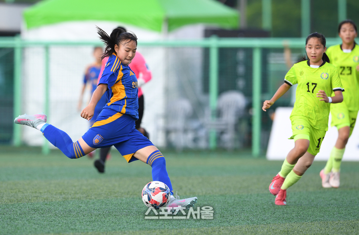 울산 현대청운중 임지혜(왼쪽)가 25일 경남 합천에서 열린 ‘2025 스포츠케이션 명품도시 합천에서 펼쳐지는 제33회 여왕기 전국여자축구대회’ 중등부 전북체육중과의 8강전에서 슛을 하고 있다. 2025. 6. 25.