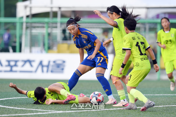 울산 현대청운중 조안(가운데)이 25일 경남 합천에서 열린 ‘2025 스포츠케이션 명품도시 합천에서 펼쳐지는 제33회 여왕기 전국여자축구대회’ 중등부 전북체육중과의 8강전에서 드리블을 하고 있다. 2025. 6. 25.