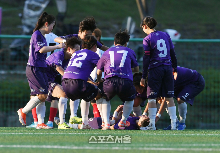 경북 대경대 선수들이 25일 경남 합천에서 열린 ‘2025 스포츠케이션 명품도시 합천에서 펼쳐지는 제33회 여왕기 전국여자축구대회’ 대학부 세종 고려대와의 경기에서 유지민(가운데 아래)의 선제골에 기뻐하고 있다. 2025. 6. 25.
