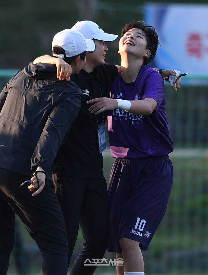 경북 대경대 유지민(오른쪽)이 25일 경남 합천에서 열린 ‘2025 스포츠케이션 명품도시 합천에서 펼쳐지는 제33회 여왕기 전국여자축구대회’ 대학부 세종 고려대와의 경기에서 선제골을 넣은 뒤 코칭스태프를 향해 달려가 안기고 있다. 2025. 6. 25.