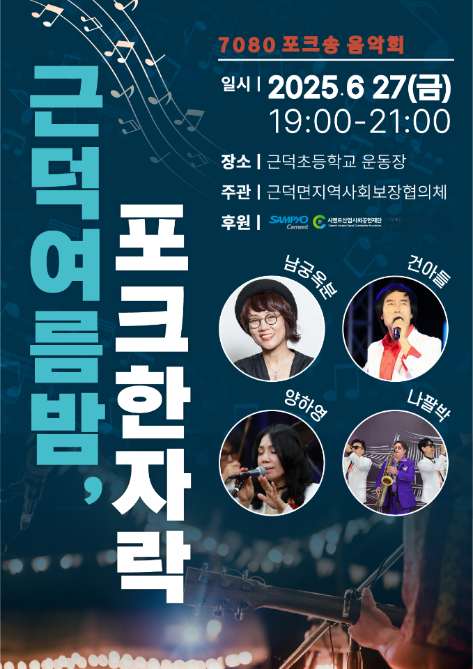 [스포츠서울ㅣ김기원기자]삼척시 근덕면지역사회보장협의체(민간위원장 김양진)는 6월 27일 근덕초등학교 운동장에서 7080 포크송 음악회 ‘근덕 여름밤, 포크 한자락’을 개최한다.