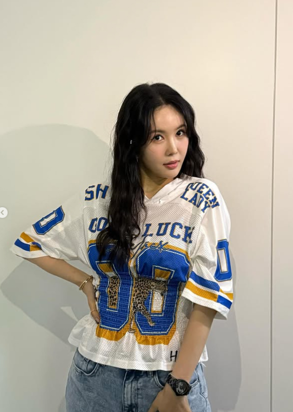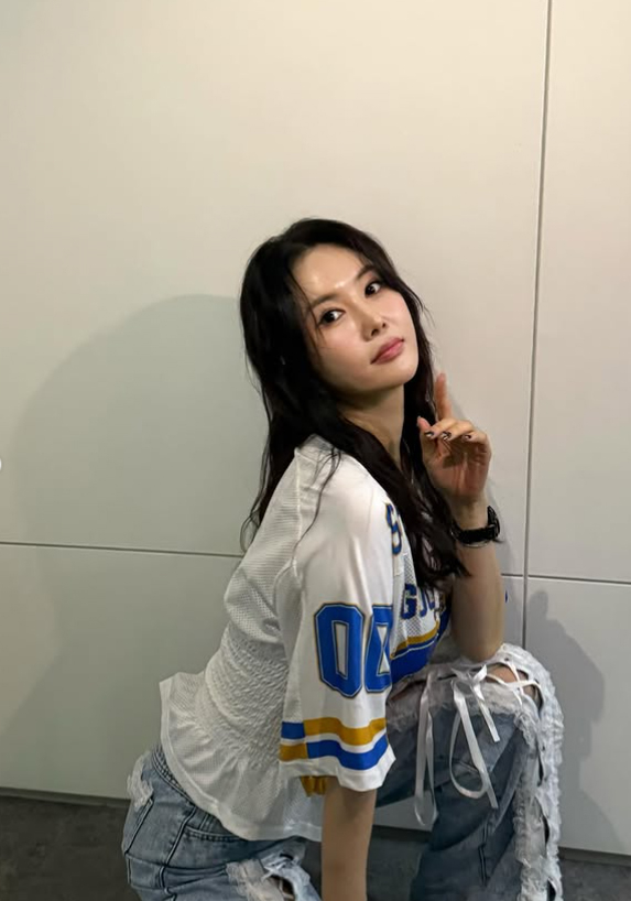 공개된 사진 속 장영란은 스포티한 느낌의 유니폼 상의에 찢어진 청바지를 매치하고 웨이브 헤어스타일로 사랑스러운 분위기를 연출했다.