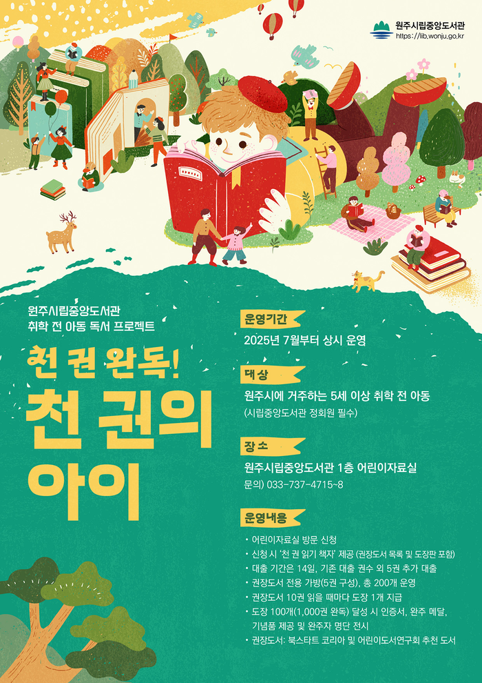 [스포츠서울ㅣ원주=김기원기자]원주시립중앙도서관은 오는 7월 1일부터 취학 전 아동을 위한 독서 진작 프로그램인 ‘2025년 천 권의 아이’를 운영한다.