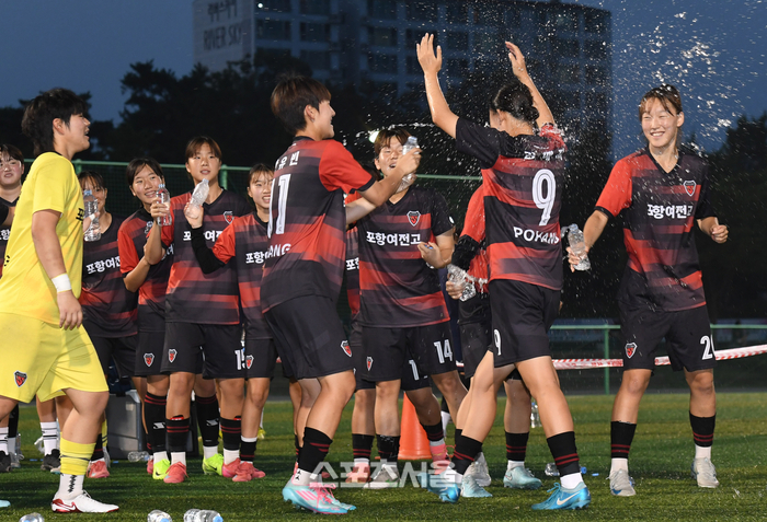 경북 포항여전고 김예지(오른쪽 두뻔째)가 27일 경남 합천에서 열린 ‘2025 스포츠케이션 명품도시 합천에서 펼쳐지는 제33회 여왕기 전국여자축구대회’ 고등부 시상식에서 최우수선수상을 수상한 뒤 팀동료들의 축하 물세례를 맞고 있다. 2025. 6. 27.