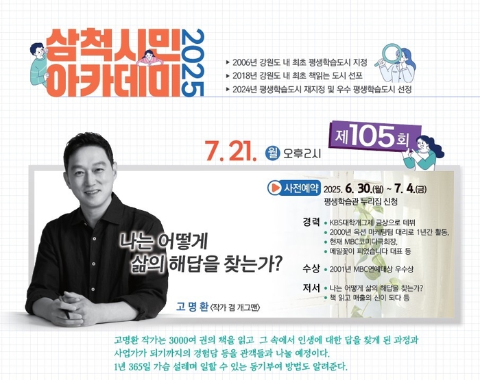 [스포츠서울ㅣ김기원기자]삼척시는 오는 7월 21일(월) 14시 평생학습관 대강당에서 고명환 작가 겸 개그맨의 현장 강연으로 진행되는 제105회 삼척시민아카데미 참여자를 모집한다고 밝혔다.