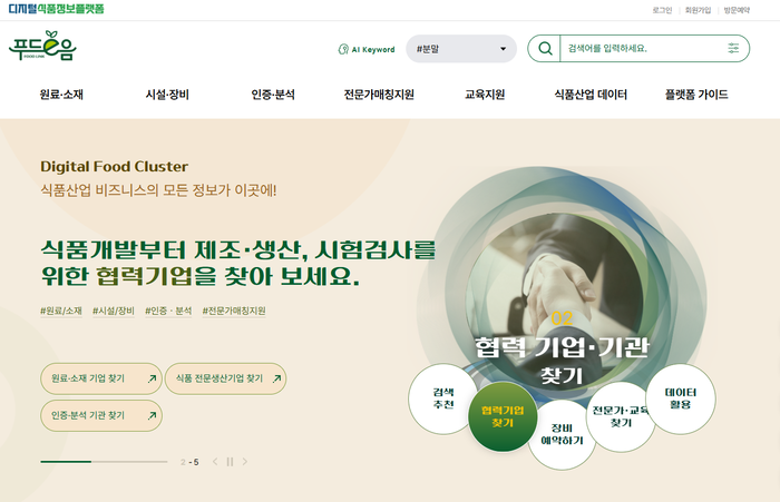 푸드e음은 식품기업 간 수요·공급 정보를 연결하고, 맞춤형 기업 정보 제공과 거래 활성화를 지원하는 식품산업 특화 온라인 플랫폼이다.