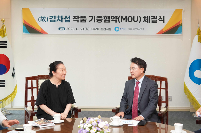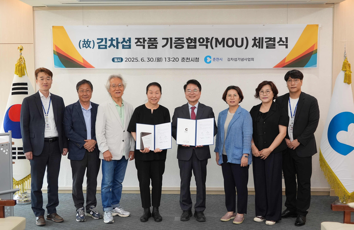 육동한 춘천시장은 30일 시청 접견실에서 고 김차섭 작가 배우자인 김명희 김차섭기념사업회 이사장, 정택주‧정영목 이사와 작품 기증 협약을 체결했다.