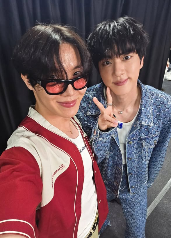 사진 속 제이홉은 진과 함께 다정한 모습으로 카메라를 바라보며 환하게 웃고 있다.