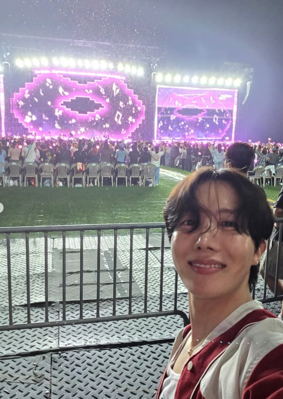 또 다른 사진에는 제이홉이 관객석에서 콘서트를 즐기는 모습이 담겼다. 팬들로 가득 찬 공연장의 뜨거운 열기와 제이홉의 행복한 미소가 어우러져 현장의 생생한 분위기가 느껴진다.