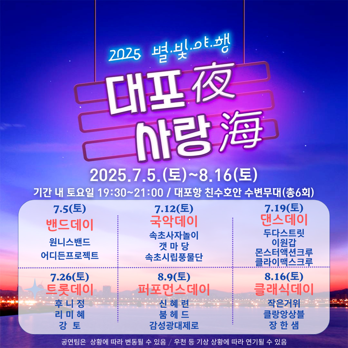 [스포츠서울ㅣ김기원기자]속초시가 여름밤의 낭만과 설렘을 담은 특별한 야외공연, ‘2025 대포夜 사랑海(대포야 사랑해)’ 콘서트를 오는 7월 5일부터 8월 16일까지 매주 토요일 저녁 7시 30분, 대포항 친수호안 수변무대에서 선보인다.