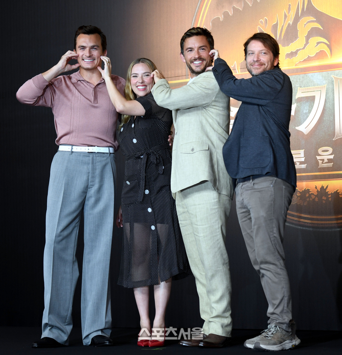 루퍼트 프렌드, 스칼렛 요한슨, 조나단 베일리, 가렛 에드워즈 감독(왼쪽부터)가 1일 포시즌스 호텔 서울에서 열린 열린 영화 ‘쥬라기 월드: 새로운 시작’ 내한 기자간담회에서 포즈를 취하고 있다.