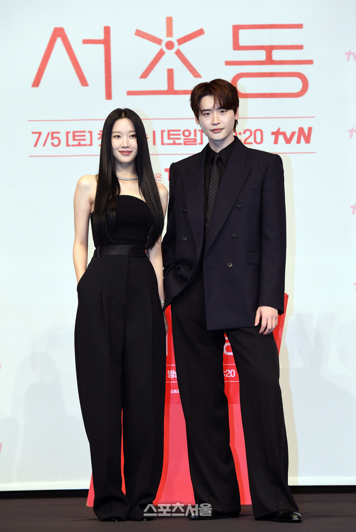배우 문가영(왼쪽)과 이종석이 1일 서울 구로구 더링크호텔에서 진행된 tvN 드라마 ‘서초동’ 제작발표회에서 취재진을 향해 포즈를 하고 있다.
