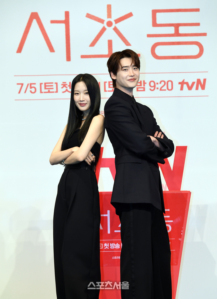 배우 문가영(왼쪽)과 이종석이 1일 서울 구로구 더링크호텔에서 진행된 tvN 드라마 ‘서초동’ 제작발표회에서 취재진을 향해 포즈를 하고 있다.