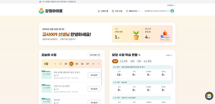 ‘강원 아이로’는 교사의 수업 준비부터 학생 맞춤형 평가, 진학 컨설팅, 행정업무 경감까지 지원하는 통합형 플랫폼이다. 특히 수업 중 통합 학습창을 활용하여 다양한 자료를 연계하고 학생 참여를 유도할 수 있으며, 수업 과정과 결과가 자동으로 기록되어 체계적인 수업 데이터 관리가 가능하다.