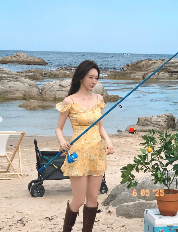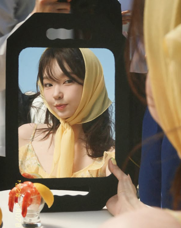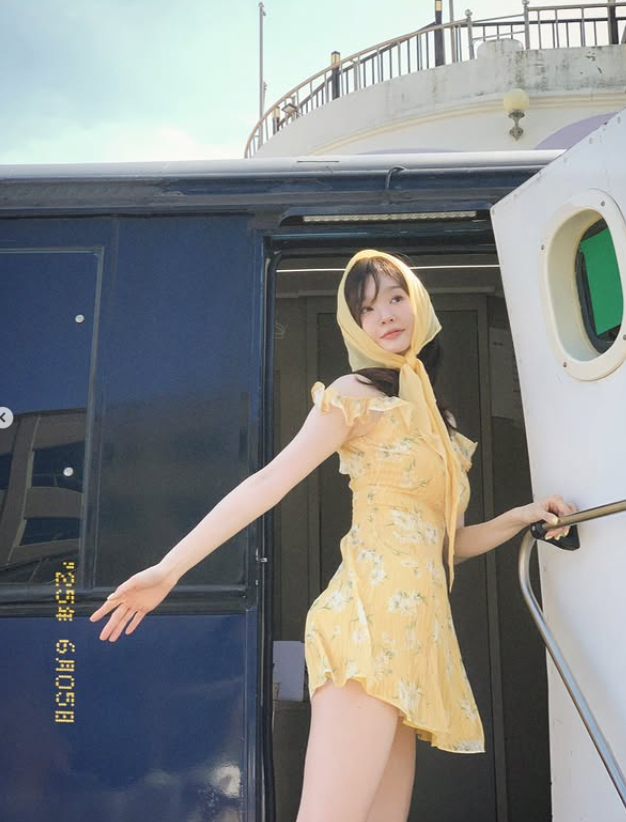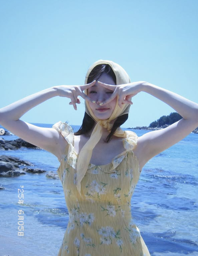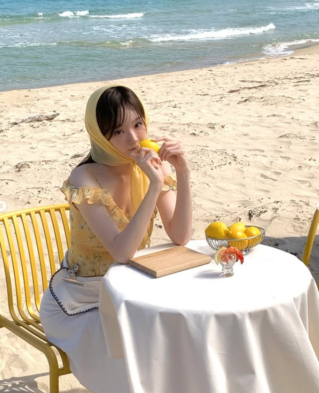 공개된 사진 속 강민경은 푸른 바다를 배경으로 상큼한 매력을 한껏 뽐냈다. 그는 노란색 꽃무늬 미니 원피스에 같은 색의 스카프를 머리에 둘러 인간 비타민 같은 싱그러움을 연출했다. 특히 해변에 마련된 테이블에 앉아 레몬을 들고 있는 모습은 마치 화보의 한 장면을 연상시키며, 그의 투명한 피부와 청순한 분위기를 더욱 돋보이게 한다.