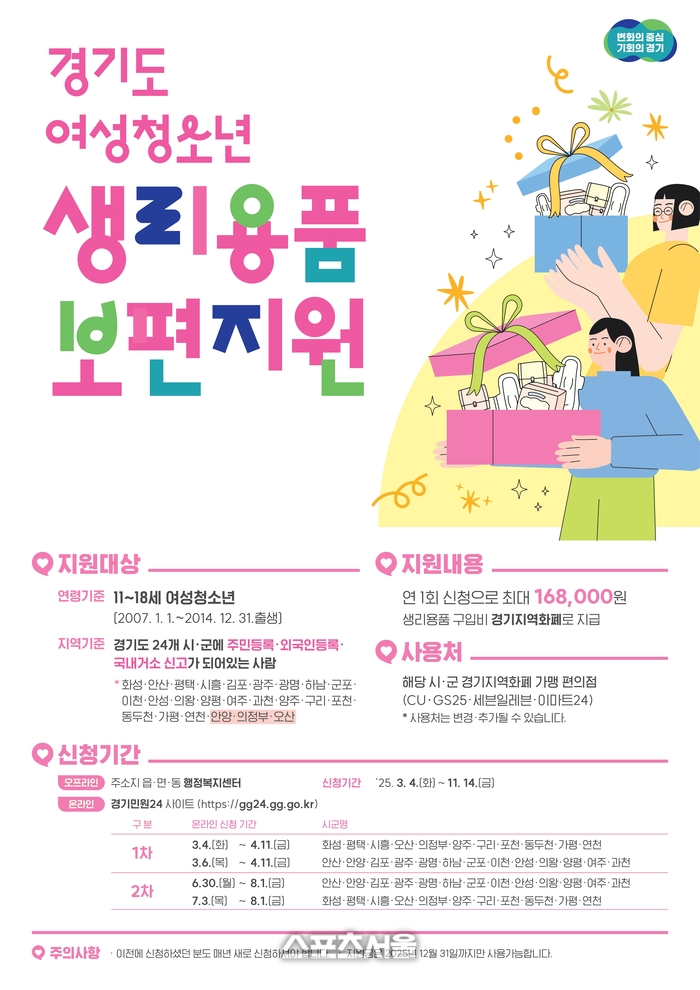 〔스포츠서울│화성=좌승훈기자〕경기 화성시는 3일부터 8월 1일까지 ‘여성청소년 생리용품 보편지원 사업’ 하반기 신청을 받는다.