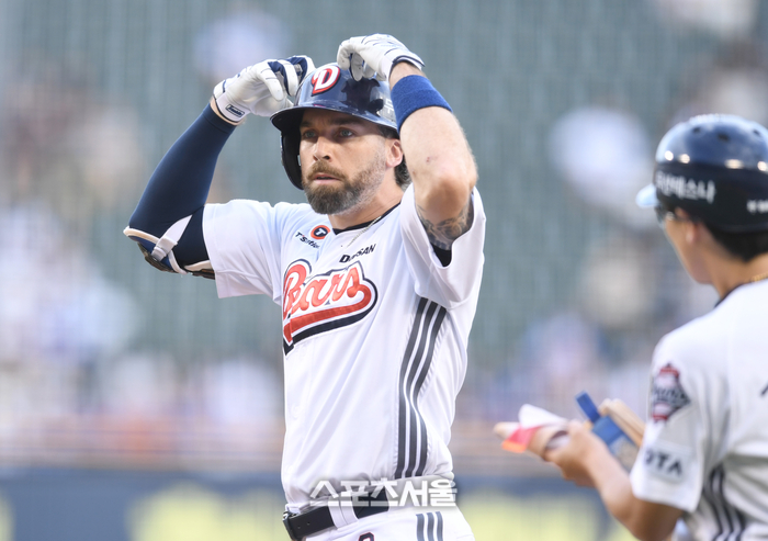 두산 케이브가 2일 서울 잠실구장에서 열린 2025 KBO리그 삼성과 경기 1회말 2사 좌전안타를 친 후 세리머니를 하고 있다.