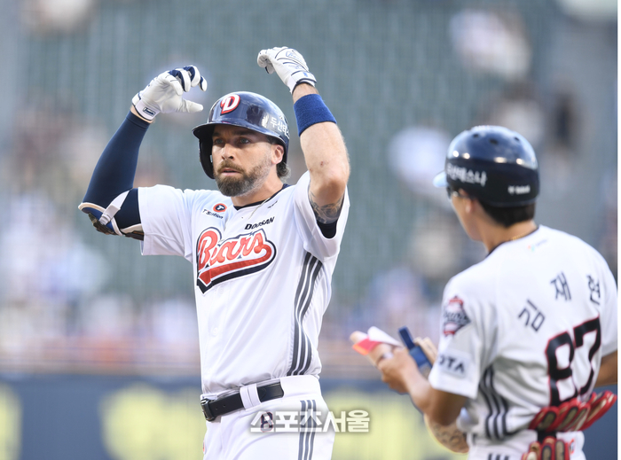 두산 케이브가 2일 서울 잠실구장에서 열린 2025 KBO리그 삼성과 경기 1회말 2사 좌전안타를 친 후 세리머니를 하고 있다.