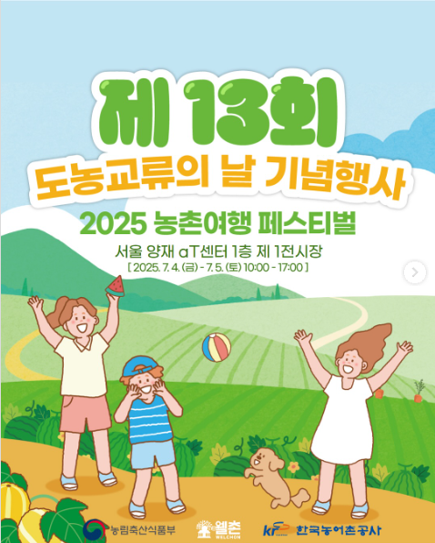 [스포츠서울ㅣ춘천=김기원기자]농림축산식품부는 여름휴가철을 맞아 도시민의 관광수요를 농촌으로 유도하고, 도농교류 활성화에 기여한 유공자들을 포상하기 위해 7월 4일(금)부터 5일(토)까지 양일간, 서울 양재 aT센터에서 ‘2025년 도농교류의 날(7.7.) 기념행사’를 개최한다.