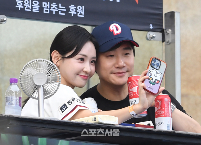 김다영 전 아나운서(왼쪽)와 방송인 배성재 부부가 3일 잠실구장에서 열린 2025 KBO리그 삼성과 두산의 경기를 관전하던 중 셀카를 찍고 있다. 배성재는 경기에 앞서 시구를 했다. 2025. 7. 3.