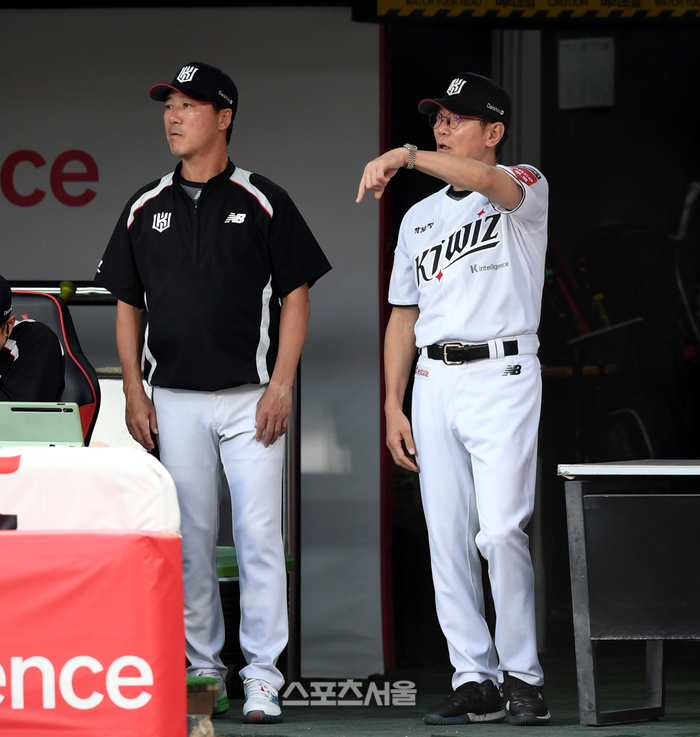 KT 이강철 감독이 3일 수원 KT위즈파크에서 열린 2025 KBO리그 키움과 경기 3회말 무사만루 로하스 희생타 때 주자들에게 무엇인가 이야기를 하고 있다.
