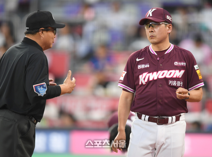 키움 홍원기 감독이 3일 수원 KT위즈파크에서 열린 2025 KBO리그 KT와 경기 4회말 수비를 마친 후 심판과 이야기를 나누고 있다.