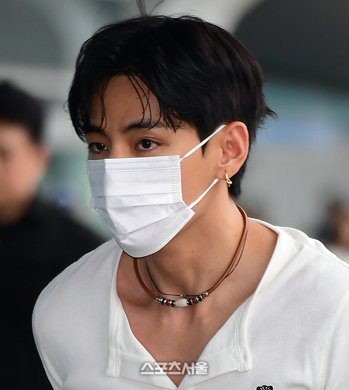 지난달 2년 여의 군복무를 마치고 처음으로 공개된 자리에서 모습을 보인 뷔는 화이트 셔츠와 연청의 데님 팬츠로 매력을 발산했다. 공항에는 뷔를 보기 위해 수백명의 팬들이 장사진을 쳐 눈길을 끌었다. 비록 마스크를 착용했지만, 조각같은 비주얼의 예리한 얼굴 라인과 빛나는 시선은 숨길 수가 없었다. 뷔는 갈색의 명품 브랜드 가방과 하트 모양의 메탈과 작은 곰인형의 키링으로 포인트를 주며 공항패션을 완성했다.