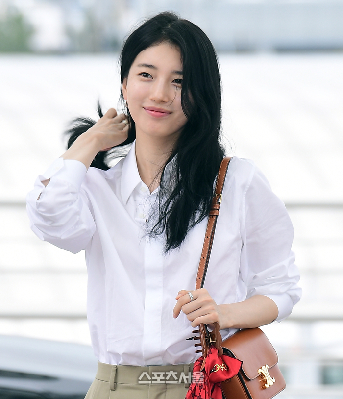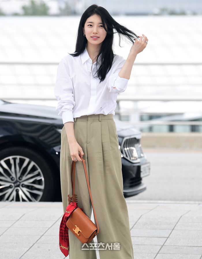 이날 수지는 자신의 도자기 피부와 일부러 매치시키 듯 투명할 정도의 화이트 셔츠를 입었고, 하의는 베이지 색상의 여유가 넘치는 와이드 팬츠를 입어 세련되면서 편한 느낌의 ‘레이디룩’을 선사했다.
