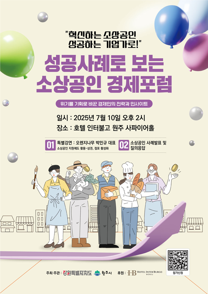 원강수 원주시장은 “이번 경제포럼이 지역경제의 핵심인 소상공인의 안정적인 경영과 지속 가능한 성장에 실질적인 도움이 되길 바란다”며 “앞으로도 소상공인 지원을 위한 다양한 정책과 협력 사업 추진에 힘쓰겠다”고 말했다.