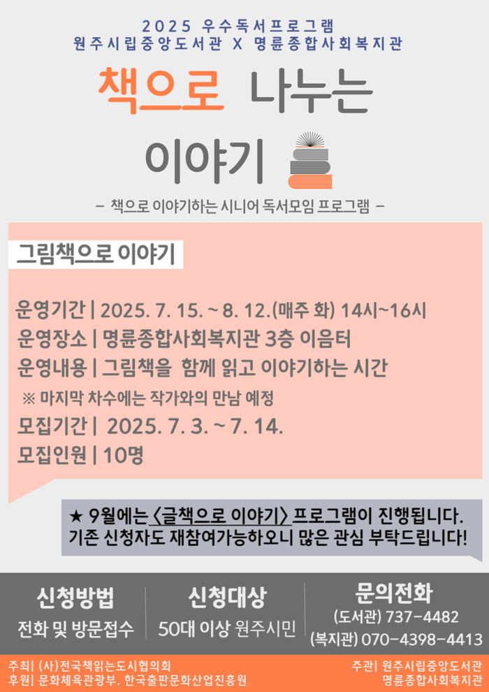 [스포츠서울ㅣ원주=김기원기자]원주시립중앙도서관은 명륜종합사회복지관과 연계해 시니어 독서모임 강좌 ‘책으로 나누는 이야기’ 프로그램을 운영한다.