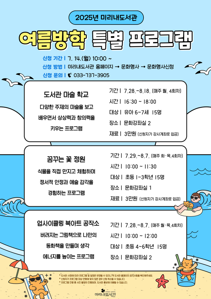 [스포츠서울ㅣ원주=김기원기자]원주시 미리내도서관은 7월 여름방학을 맞아 유아와 초등학생을 위한 ‘여름 독서학교’ 및 ‘방학 특별 프로그램’을 운영한다.
