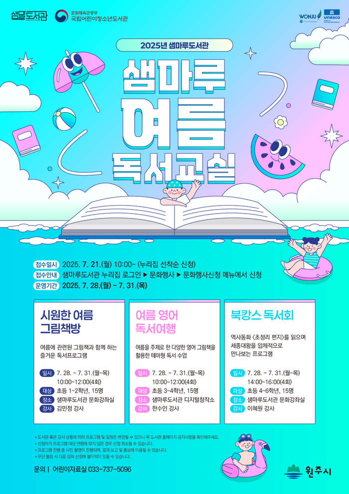 프로그램 신청은 7월 21일(월) 오전 10시부터 도서관 누리집(lib.wonju.go.kr/sm)을 통해 선착순으로 접수한다. 자세한 사항은 샘마루도서관(☎033-737-5096)으로 문의하면 된다.