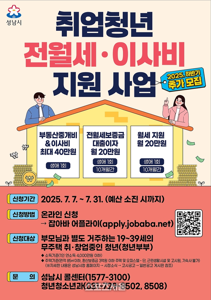 〔스포츠서울│성남=좌승훈기자〕경기 성남시는 오는 31일까지 ‘취업 청년 전월세·이사비 지원사업’ 참여 희망자 625명을 추가 모집한다고 7일 밝혔다.