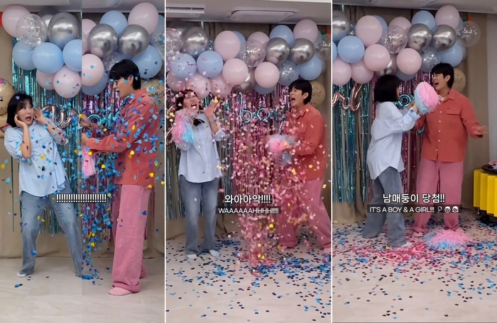 모두가 숨죽인 가운데, 첫 번째 풍선에서는 파란색 콘페티가 흩날리며 아들임을 알렸다. 자연스레 두 번째 풍선에 집중됐다. 이어 풍선을 터뜨리자 분홍색 콘페티가 사방으로 쏟아졌다.