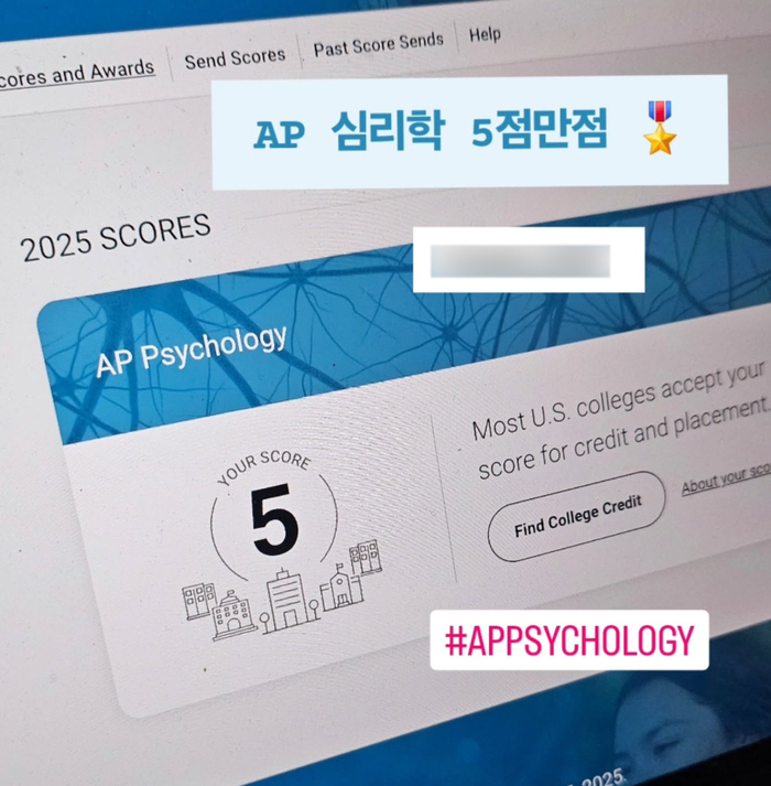 공개된 사진에는 AP 심리학 시험 점수 페이지가 담겨 있으며 ‘Your Score 5’라는 만점 기록이 선명하게 나타나 있다.