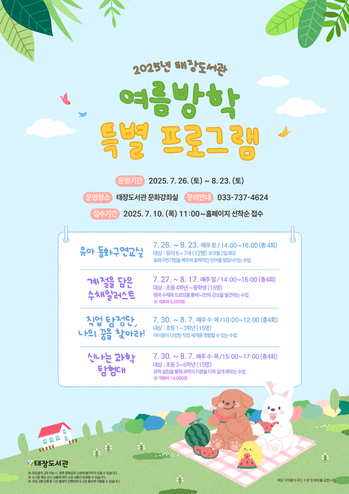 7월 10일(목) 오전 11시부터 도서관 홈페이지(lib.wonju.go.kr/tj)를 통해 선착순으로 모집한다. 자세한 사항은 태장도서관(☎033-737-4624)으로 문의하면 된다.