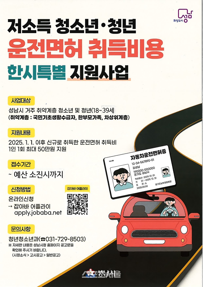 〔스포츠서울│성남=좌승훈기자〕경기 성남시는 저소득 청소년과 청년들의 경제적 부담을 줄이고 원활한 사회 진출을 돕기 위해 운전면허 취득비용을 최대 50만원 지원한다고 8일 밝혔다.