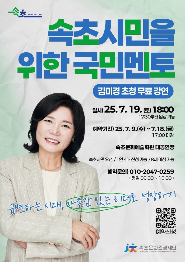 한편, 강연 예매는 7월 9일 오전 10시부터 18일 17시까지 진행되며, 자세한 사항은 속초문화관광재단 누리집에서 확인할 수 있다.