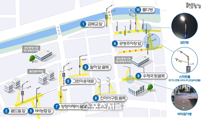 시는 지난 2월과 3월 중앙시장 상인회와 통장 등 지역의 특성을 잘 아는 주민과 용인동부경찰서와 함께 사업대상지 의견을 수렴했다. 4월에는 시설물 실시설계를 완료하고 7월 공사를 시작했다.