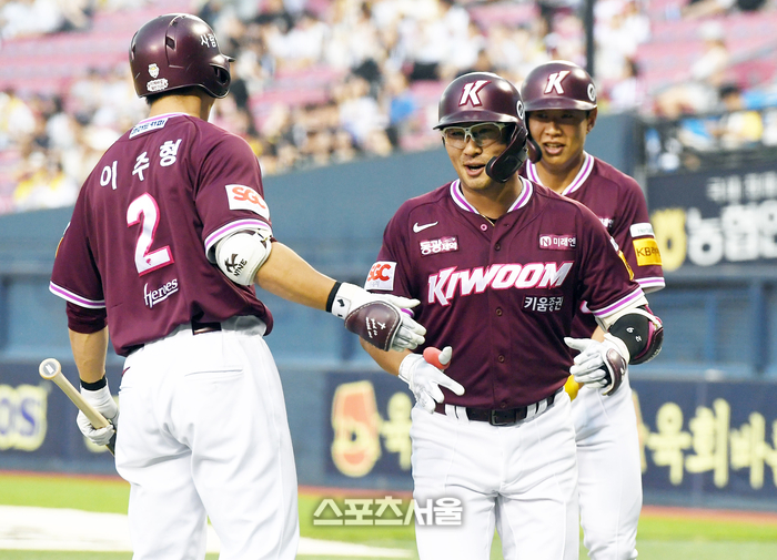 키움 임지열이 8일 잠실구장에서 열린 2025 KBO리그 LG와 경기 1회초 무사 1루 상황에서 LG 선발투수 임찬규를 상대로 2점 홈런을 친 뒤 이주형과 하이파이브를 하고 있다. 2025. 7. 8.