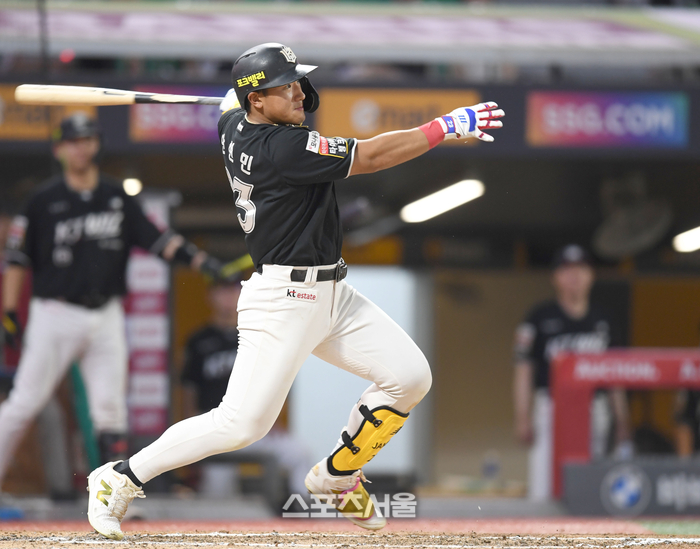 SSG 안현민이 8일 인천 SSG랜더스필드에서 열린 2025 KBO리그 KT와 경기 6회초 타구를 바라보고 있다. 2루수 플라이 아웃.