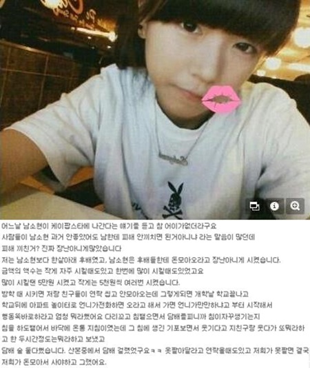 마지막으로 이 네티즌은 '이런 사람이 K팝스타에 나와서 온갖 순한척은 다한다니 정말 어이가 없다'라며 '영악하게도 고등학교가서 이미지 관리 하더니 자기 담배도 술도 안한다고 그러더라. 남에게 고통을 주고 압박감을 주던 사람이 자기는 좋아하는거 하면서 잘 되가면 억울하지 않겠느냐'고 이 글을 게재하게 된 이유를 설명했다.