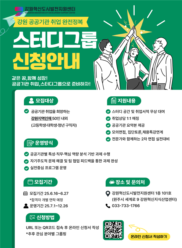 7월~12월까지, 원주권 지역인재 50명 대상 공공기관 취업 스터디그룹 운영