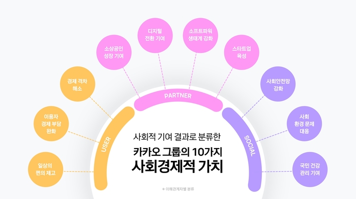 특히 카카오 서비스가 창출한 사회경제적 가치를 이용자·파트너·사회 등 이해관계자별 기여 가치 기준으로 10가지 분야로 구분해 ▲일상의 편의 제고 ▲사회 안전망 강화 ▲사회·환경문제 대응 ▲국민 건강 관리 ▲소상공인 성장 ▲디지털 전환 ▲소프트파워 생태계 강화 ▲스타트업 육성 ▲이용자 경제 부담 완화 ▲경제 격차 해소 등 10개 분야에서 기여해온 성과를 확인했다.